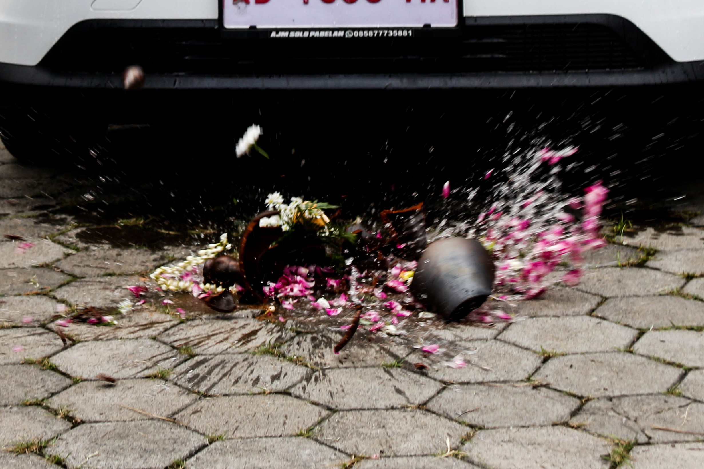 Prosesi pemecahan kendi berisi air bunga oleh G.R.Aj. Ancillasura Marina Sudjiwo sebagai simbol peresmian ambulans listrik di depan Dalem Prangwedanan, Kamis (05/02/2026). Ilham Nur Arifin/LPM Kentingan
